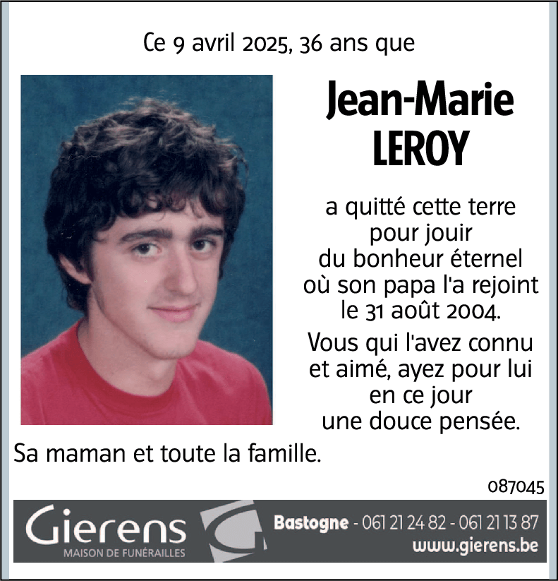 Ce 9 avril 2025, 36 ans que Jean-Marie LEROY a quitté cette terre pour jouir du bonheur éternel où son papa l'a rejoint le 31 août 2004. Vous qui l'avez connu et aimé, ayez pour lui en ce jour une douce pensée. Sa maman et toute la famille.