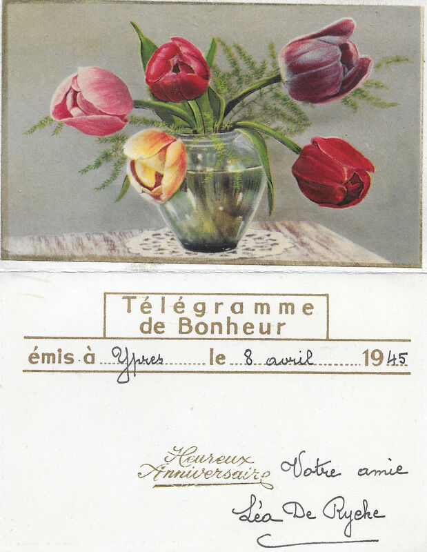 Au hasard de rangements, j'ai retrouvé un "télégramme" envoyé de Ypres à ma maman le 8 avril 1945, jour de son anniversaire, il est signé : votre amie Léa de Rycke. Maman est née en 1930 et s'appelait Anne-Marie Hobleu, Peut-être avez-vous une photo des amies de l'époque?