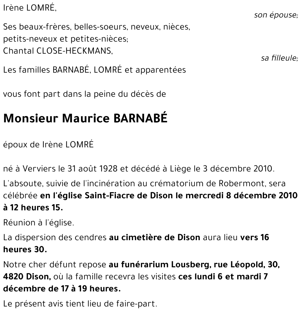 Maurice BARNABé à Liège: avis de décès