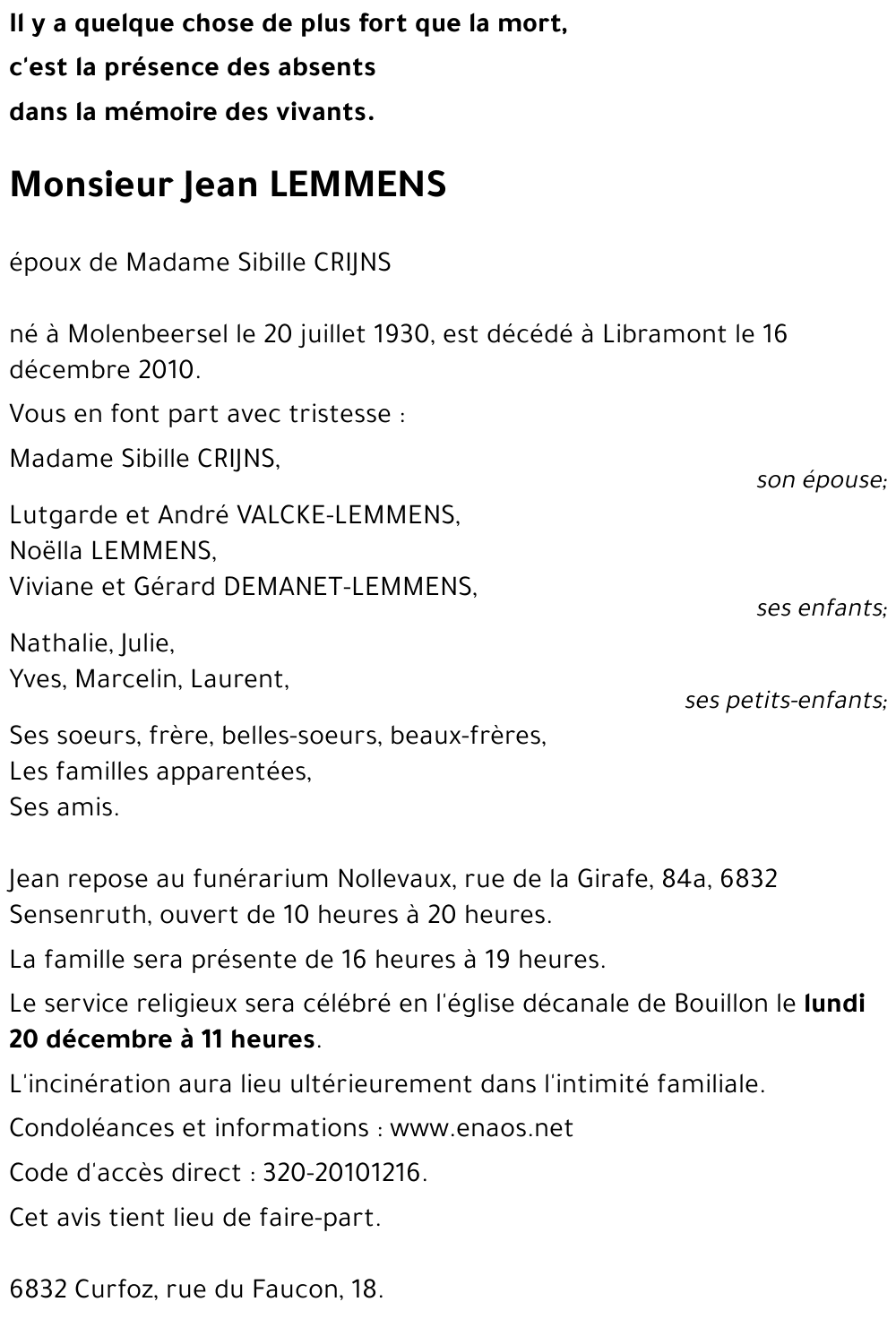 Jean LEMMENS à Libramont-Chevigny: avis de décès