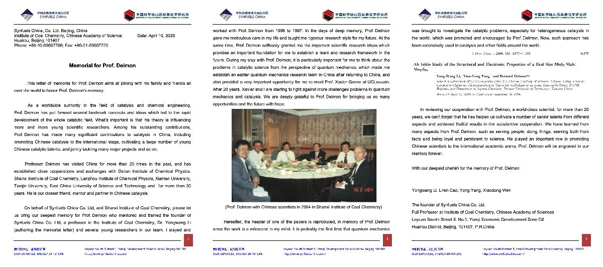 I would like to express my heartfelt condolences for the loss of Professor Bernard Delmon to his family and friends. I will always remember the pioneer in catalysis, my respected teacher.