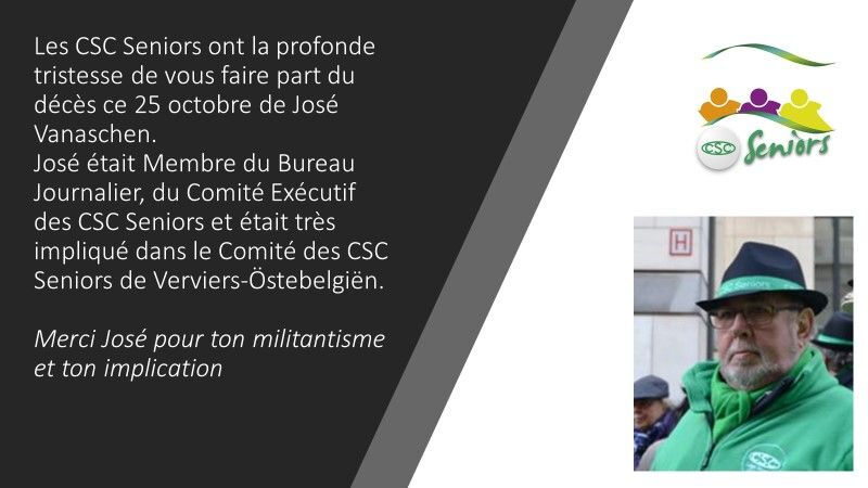 Au nom des CSC Seniors, je vous présente nos plus sincères condoléances suite au décès de notre compagnon de militance José.