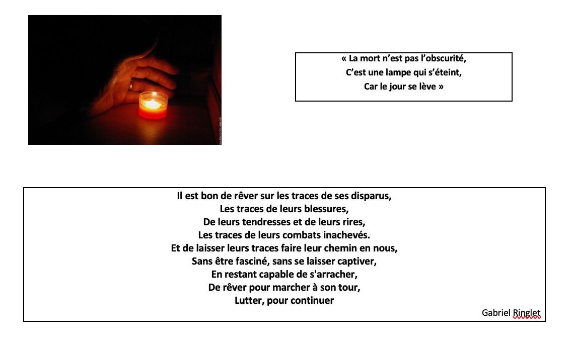 Que l’Espérance, la Paix, la Sérénité habitent vos cœurs. Puisse Anne-Marie être davantage et mieux encore présente à vos côtés malgré l’absence physique. Vous ne la verrez plus et pourtant elle sera là, sur le chemin de la Vie, juste un peu plus loin, libérée de ses entraves humaines.
