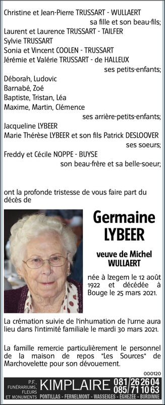 Je vous présente mes plus sincères condoléances suite au décès de Madame Lybeer.