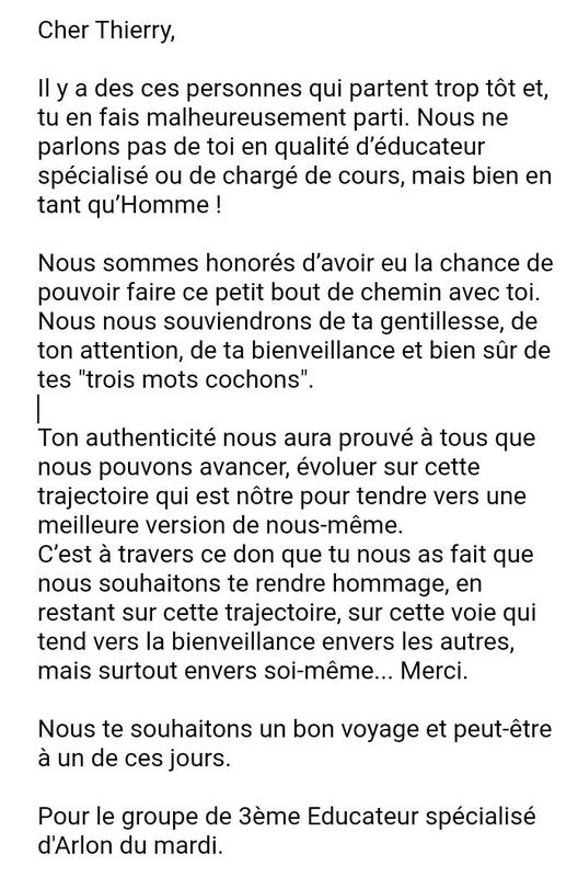 Thierry était un homme humble, bon, doux, généreux, patient. Il m'a beaucoup apporté. Il est gravé dans nos mémoires.