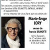 KAIN - TOURNAI Francis DELMOTTE (†), son époux ; Xavier DELMOTTE, Bernadette DELMOTTE, Vincent DELMOTTE (†), François DELMOTTE et Sandrine PINTO, ses enfants et sa belle-fille ; Elisabeth DELMOTTE et Richard SORDO PEREZ, Mathilde DELMOTTE et Dorian RIGOBERT, ses petites-filles et leur compagnon ; Daniel (†) et Marie-Paule HENROTTE-LORY, Jean et Thérèse (†) LORY-BONNET, ses frère, sœur, beau-frère et belle-sœur ; Ses cousins, cousines, neveux, nièces, filleules, Les familles LORY, DELMOTTE, BATAILLE, WIBAUT et apparentées ont la tristesse de vous faire part du décès de Marie-Ange LORY veuve de Francis DELMOTTE née à Gaurain le 1er octobre 1932 et décédée à Kain le 18 avril 2023. Les funérailles seront célébrées en l'église Notre-Dame de la Tombe à Kain le samedi 22 avril 2023 à 11 heures. Réunion à l'église. L'offrande tiendra lieu de condoléances. Son corps sera ensuite incinéré et les cendres déposées dans le caveau familial au cimetière du Sud à Tournai. Dans l'attente des funérailles, Marie-Ange repose au funérarium Fernand Ladavid à Tournai 18, chaussée de Douai. Visites de 11 à 19 heures. La famille remercie de tout cœur toutes les personnes qui s'associeront à sa peine. Le présent avis tient lieu de faire-part. 7540 Kain, rue des Ecoles, 52.