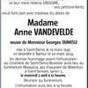 Frédéric et Pascale DUMESLE-VANDAELE, son fils et sa belle-fille ; Timothé DUMESLE et Céleste DUMESLE, et leur mère Hélène GREGOIRE, ses petits-enfants ; vous font part avec tristesse du décès de Madame Anne VANDEVELDE veuve de Monsieur Georges DUMESLE née à Saint-Denis le 19 mars 1943 et décédée à Namur le 29 mars 2024. Un dernier hommage avant l'inhumation au cimetière de Saint-Denis-Bovesse aura lieu au funérarium Massaux, 462, chaussée de Waterloo à Saint-Servais, salon 5, le mercredi 3 avril à 12 heures. Réunion au funérarium. L'inhumation aura lieu à 14 heures. Le présent avis tient lieu de faire-part.