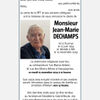 ATH - HOLLAIN Tu resteras toujours dans nos cœurs. Geoffrey DECHAMPS et Virginie BROUEZ, Jérôme DECHAMPS et Melissa DEMUYNCK, ses enfants ; Zélia, Cyril, Zoé, Chléa, Maho, ses petits-enfants ;Anita, son amie ;Le cercle de la RTT et ses anciens collégues ont la tristesse de vous annoncer le décès de Monsieur Jean-Marie DECHAMPS né à Tournai le 15 juin 1954 et décédé à Ath le 13 novembre 2024. La cérémonie religieuse aura lieu au crématorium "Les Blancs Arbres", 1A, rue des Blancs Arbres à Hacquegnies, ce mardi 19 novembre 2024 à 10 heures. Son corps sera ensuite incinéré et ses cendres seront inhumées dans le caveau de famille au cimetière d'Hollain vers 14 heures. Une dernière visite peut lui être rendue au funérarium Desablens, Grand-Route, 250 à Gaurain-Ramecroix tous les jours de 12 à 18h. La famille remercie la direction et le personnel du home "l'Esplanade" à Ath, pour les bons soins apportés au défunt ainsi que toutes les personnes qui s'associeront à son deuil. Le présent avis tient lieu de faire-part. 7903 Blicquy, rue du Couvent, 67.