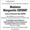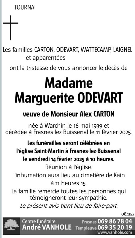 TOURNAI Les familles CARTON, ODEVART, WATTECAMP, LAIGNEL et apparentées ont la tristesse de vous annoncer le décès de Madame Marguerite ODEVART veuve de Monsieur Alex CARTON née à Warchin le 16 mai 1939 et décédée à Frasnes-lez-Buissenal le 11 février 2025. Les funérailles seront célébrées en l'église Saint-Martin à Frasnes-lez-Buissenal le vendredi 14 février 2025 à 10 heures. Réunion à l'église. L'inhumation aura lieu au cimetière de Kain à 11 heures 15. La famille remercie toutes les personnes qui témoigneront leur sympathie. Le présent avis tient lieu de faire-part.