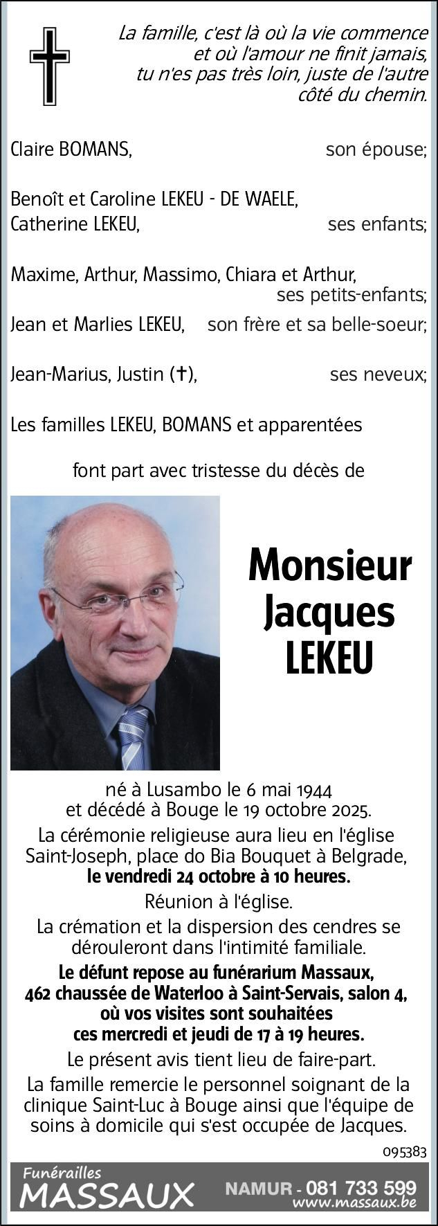 La famille, c'est là où la vie commence et où l'amour ne finit jamais, tu n'es pas très loin, juste de l'autre côté du chemin. Claire BOMANS, son épouse ; Benoît et Caroline LEKEU-DE WAELE, Catherine LEKEU, ses enfants ; Maxime, Arthur, Massimo, Chiara et Arthur, ses petits-enfants ; Jean et Marlies LEKEU, son frère et sa belle-sœur ; Jean-Marius, Justin ( ? ), ses neveux ; Les familles LEKEU, BOMANS et apparentées vous font part avec tristesse du décès de Monsieur Jacques LEKEU né à Lusambo le 6 mai 1944 et décédé à Bouge le 19 octobre 2025. La cérémonie religieuse aura lieu en l'église Saint-Joseph, place do Bia Bouquet à Belgrade, le vendredi 24 octobre à 10 heures. Réunion à l'église. La crémation et la dispersion des cendres se dérouleront dans l'intimité familiale. Le défunt repose au funérarium Massaux, 462, chaussée de Waterloo à Saint-Servais, salon 4, où vos visites sont souhaitées ces mercredi et jeudi de 17 à 19 heures. Le présent avis tient lieu de faire-part. La famille remercie le personnel soignant de la clinique Saint-Luc à Bouge, ainsi que l'équipe de soins à domicile, qui s'est occupée de Jacques.