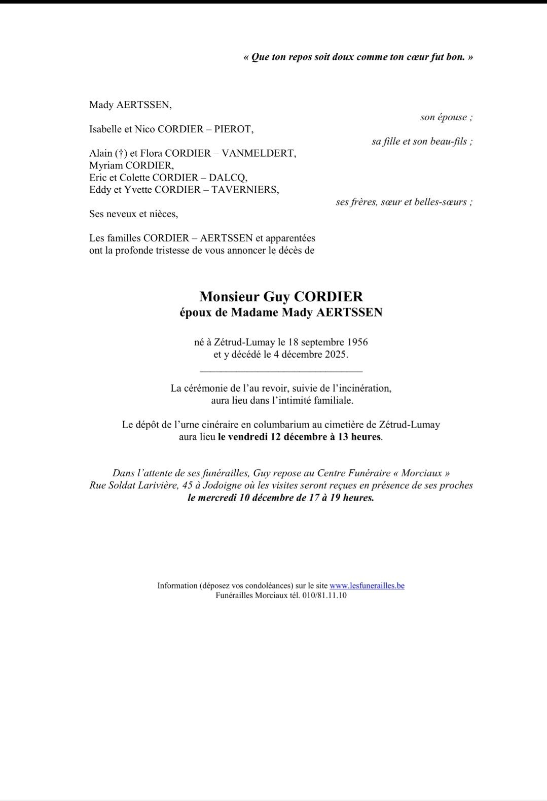 « Que ton repos soit doux comme ton cœur fut bon. » Mady AERTSSEN, son épouse ; Isabelle et Nico CORDIER-PIEROT, sa fille et son beau-fils ; Alain (†) et Flora CORDIER-VANMELDERT, Myriam CORDIER, Eric et Colette CORDIER-DALCQ, Eddy et Yvette CORDIER-TAVERNIERS, ses frères, sœur et belles-sœurs ; Ses neveux et nièces, Les familles CORDIER-AERTSSEN et apparentées ont la profonde tristesse de vous annoncer le décès deMonsieur Guy CORDIER époux de Madame Mady AERTSSEN né à Zétrud-Lumay le 18 septembre 1956 et y décédé le 4 décembre 2025. _______________________________ La cérémonie de l’au revoir, suivie de l’incinération, aura lieu dans l’intimité familiale. Le dépôt de l’urne cinéraire en columbarium au cimetière de Zétrud-Lumay aura lieu le vendredi 12 décembre à 13 heures. Dans l’attente de ses funérailles, Guy repose au Centre Funéraire « Morciaux », rue Soldat Larivière, 45 à Jodoigne, où les visites seront reçues en présence de ses proches le mercredi 10 décembre de 17 heures à 19 heures. Information (déposez vos condoléances) sur le site www.lesfunerailles.be