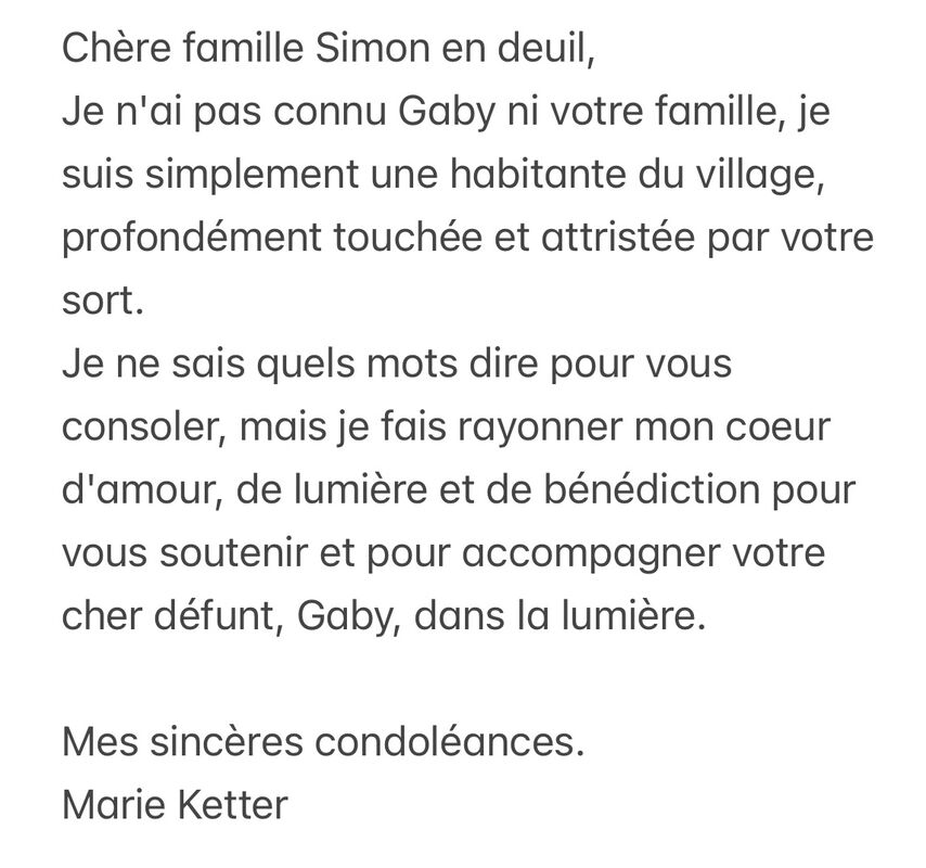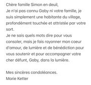 Cette terrible et inévitable fatalité qui vient de vous frapper nous marque nous aussi au plus profond de nos cœurs, Gaby était une belle personne que nous appréciions tellement. Soyez certains que nos pensées les plus aimantes sont avec vous. Nelly,Bernard
