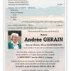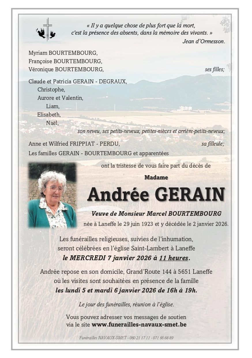 « Il y a quelque chose de plus fort que la mort, c'est la présence des absents, dans la mémoire des vivants. » Jean d’Ormesson Myriam BOURTEMBOURG, Françoise BOURTEMBOURG, Véronique BOURTEMBOURG, ses filles ; Claude et Patricia GERAIN-DEGRAUX,    Christophe,    Aurore et Valentin,       Liam,    Elisabeth,       Naël,  son neveu, ses petits-neveux, petites-nièces et arrière-petits-neveux ; Anne et Wilfried FRIPPIAT-PERDU, sa filleule ; Les familles GERAIN-BOURTEMBOURG    et apparentées ont la tristesse de vous faire part du décès de Madame Andrée GERAIN veuve de Monsieur Marcel BOURTEMBOURG née à Laneffe le 29 juin 1923 et y décédée le 2 janvier 2026. Les funérailles religieuses, suivies de l’inhumation, seront célébrées en l’église Saint-Lambert à Laneffe  le mercredi 7 janvier 2026 à 11 heures. Andrée repose en son domicile, Grand’Route, 144 à 5651 Laneffe, où les visites sont souhaitées les lundi 5 et mardi 6 janvier 2026 de 16 à 19 heures. Le jour des funérailles, réunion à l’église. Vous pouvez adresser vos messages de soutien via le site :  www.funerailles-navaux-smet.be