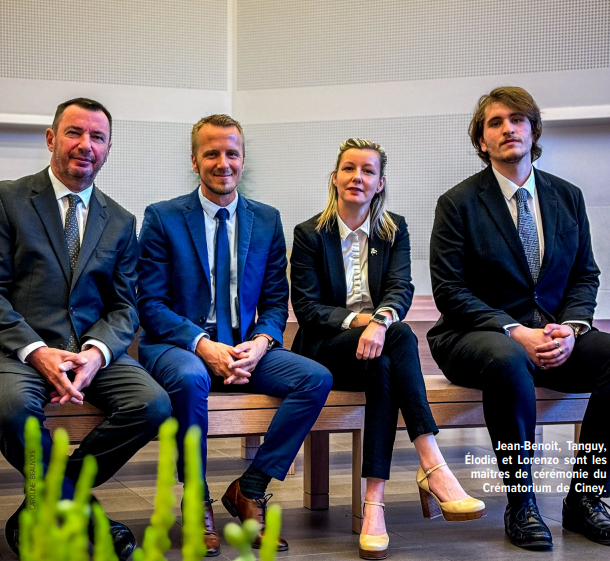 Il nous accueille avec un sourire chaleureux, comme un contraste étonnant dans un lieu que l’on associe spontanément à la gravité. Jean-Benoît Page est directeur du Crématorium et Parc Mémorial du Cœur de Wallonie, à Ciney. Le dôme pyramidal vitré de l’accueil laisse passer la lumière naturelle. Costume impeccable, Jean-Benoît déclare d’emblée : « On pense souvent que notre métier est tourné vers les défunts, mais en réalité, ce qu’on fait ici c’est avant tout pour ceux qui restent. C’est eux qu’on accompagne. » Son rôle ? « On est des passeurs d’eau, on aide les familles à traverser d’une rive à l’autre. » Et pour que le passage se fasse sans accroche, il peut compter sur toute une équipe. Tanguy, Élodie et Lorenzo, également maîtres de cérémonie. « Mais on est polyvalent. On est presque tous formés au maniement des appareils de crémation, à l’accueil, aux tâches administratives. Mais le cœur du métier est maître de cérémonie, c’est aussi le poste le plus difficile puisqu’il faut pouvoir gérer ses émotions… » A la cafétéria, Sandra, Nancy et Morgane se chargent des réceptions, Robin est à la technique, Jérémy au jardin.