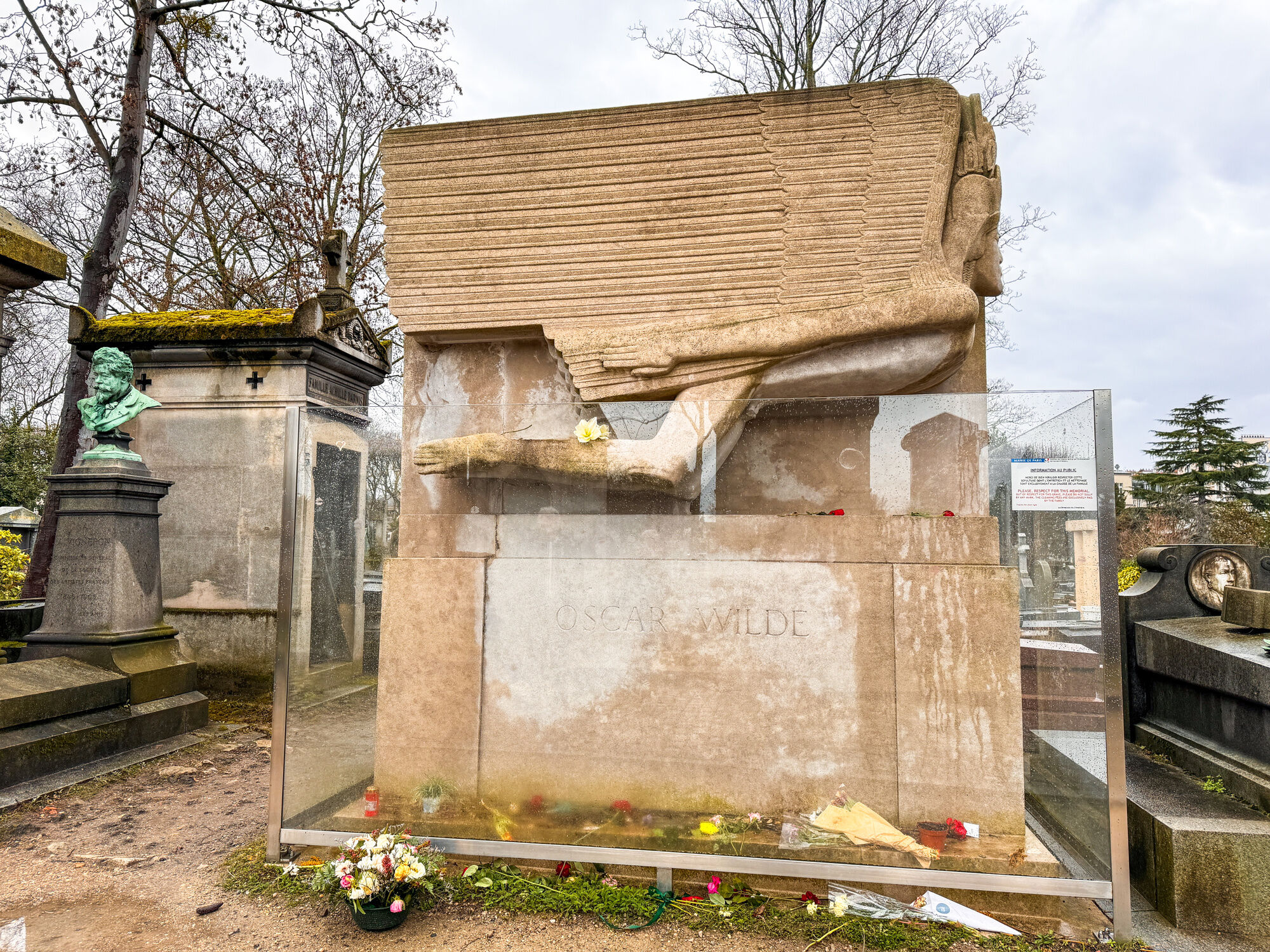 Plus tard, elle s’arrête également devant la tombe d’Oscar Wilde, le décor qui a inspiré le cours métrage de Paris, je t’aime de Wes Craven. « Ça permet de s’arrêter aussi sur cette sépulture, œuvre hommage imaginée par Jacob Epstein, qui a fait scandale à cause de la générosité de l’appareil génital du sphinx… » Représenter un ange nu avec un sexe était plutôt osé à l’époque.