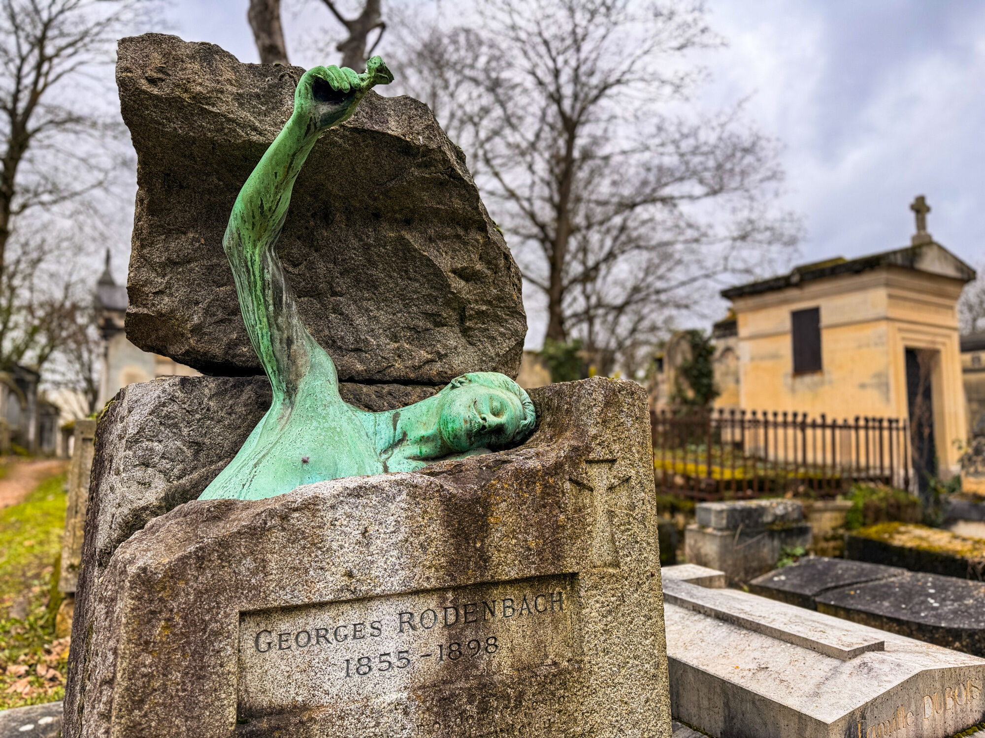 On y retrouve aussi la tombe du poète symboliste et romancier flamand francophone de la fin du XIXe siècle Georges Rodenbach. Premier écrivain belge à réussir à Paris, Il est l’auteur d’un des chefs-d’œuvre de la littérature « fin de siècle », Bruges-la-morte. Impossible de rater son monument funéraire, qui montre le poète sortant du tombeau, une rose à la main (voir photo 1).