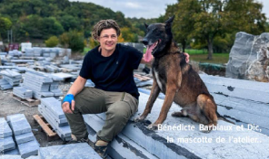 On est à Andenne, aux Artisans de la Pierre. Dic, un Malinois aussi massif que doux avance vers nous. « C’est un gentil, ne vous en faites pas ! », lance Bénédicte Barbiaux en arrivant, sourire aux lèvres. « J’ai recueilli ce chien il y a quelques mois. Il vivait dans une cage, le pauvre… Un café ? »