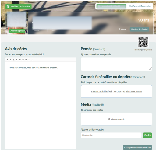 Il permettra aux visiteurs d’accéder à l’avis nécrologique et aux informations que vous aurez publiées dans l’espace dédié au défunt.