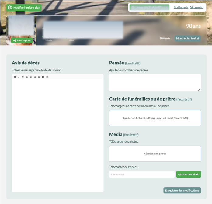 - Un espace mémoriel pour chaque défunt : les proches y agrègent hommages, textes, photos et vidéos. Toutes les informations, souvenirs et messages sont réunis en un point unique.Ce point transforme le deuil en une mémoire partagée et organisée.